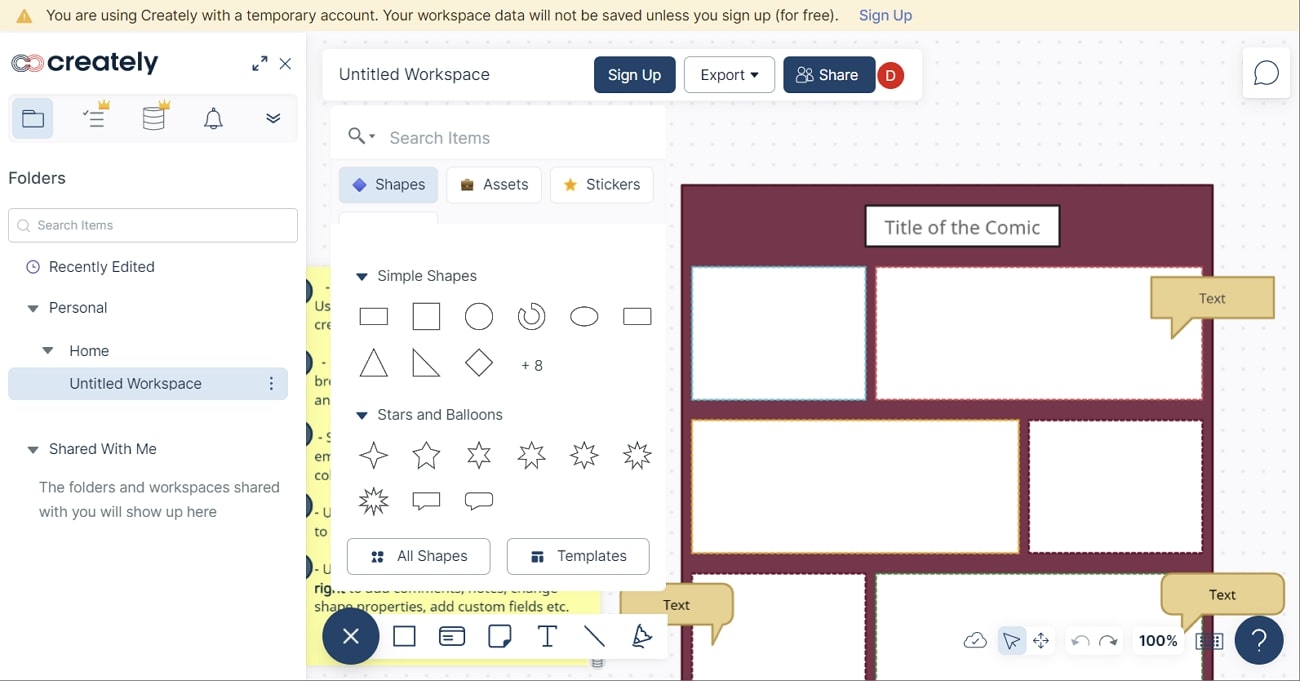With Creatly, you can implement your imagination on comic strips and share it with the world. It is one of the greatest visual platforms for professionally creating customized comic strips. Now, you can not only create comic strips but can also share them with the world via links. This comic generator also offers you to export comic strips in JPEG, PDF, PNG, and several other formats.