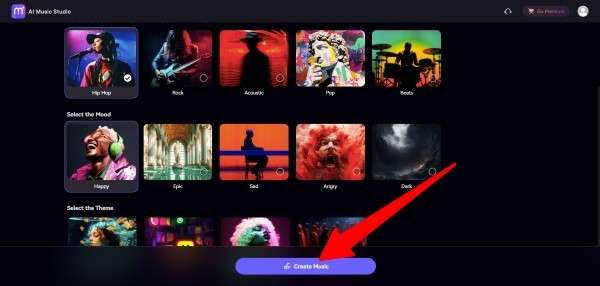 Firstly, head over to Media.io's AI Music Generator. Once you're there, you'll see a button that says "Create Music." Click on it to begin your musical adventure.