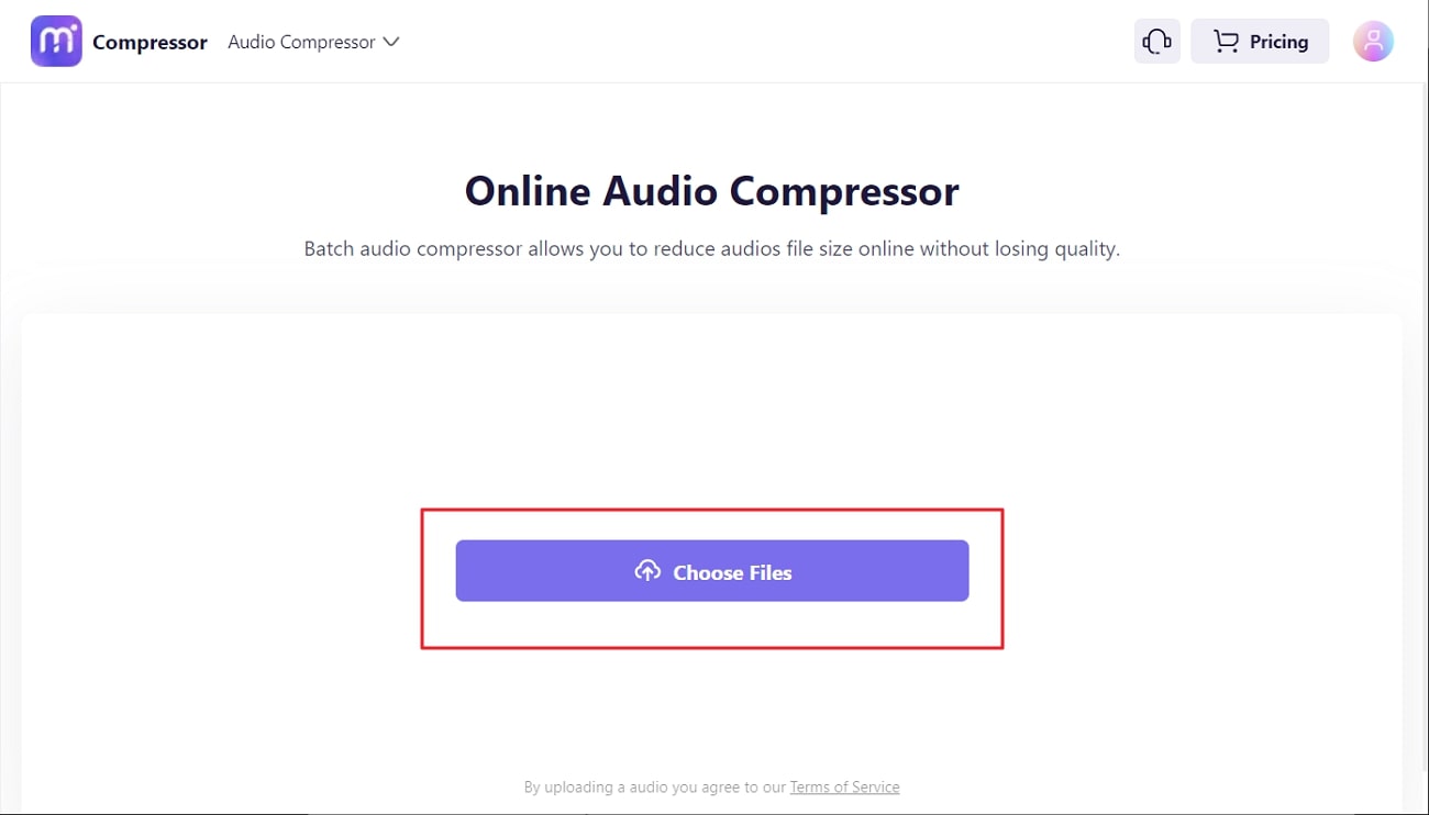 To start, open your browser and search "Media.io - Audio Compressor." From the audio compression interface, click "Choose File" and add the audio of your choice. You can click "Add more files” to add more audio for compression.
