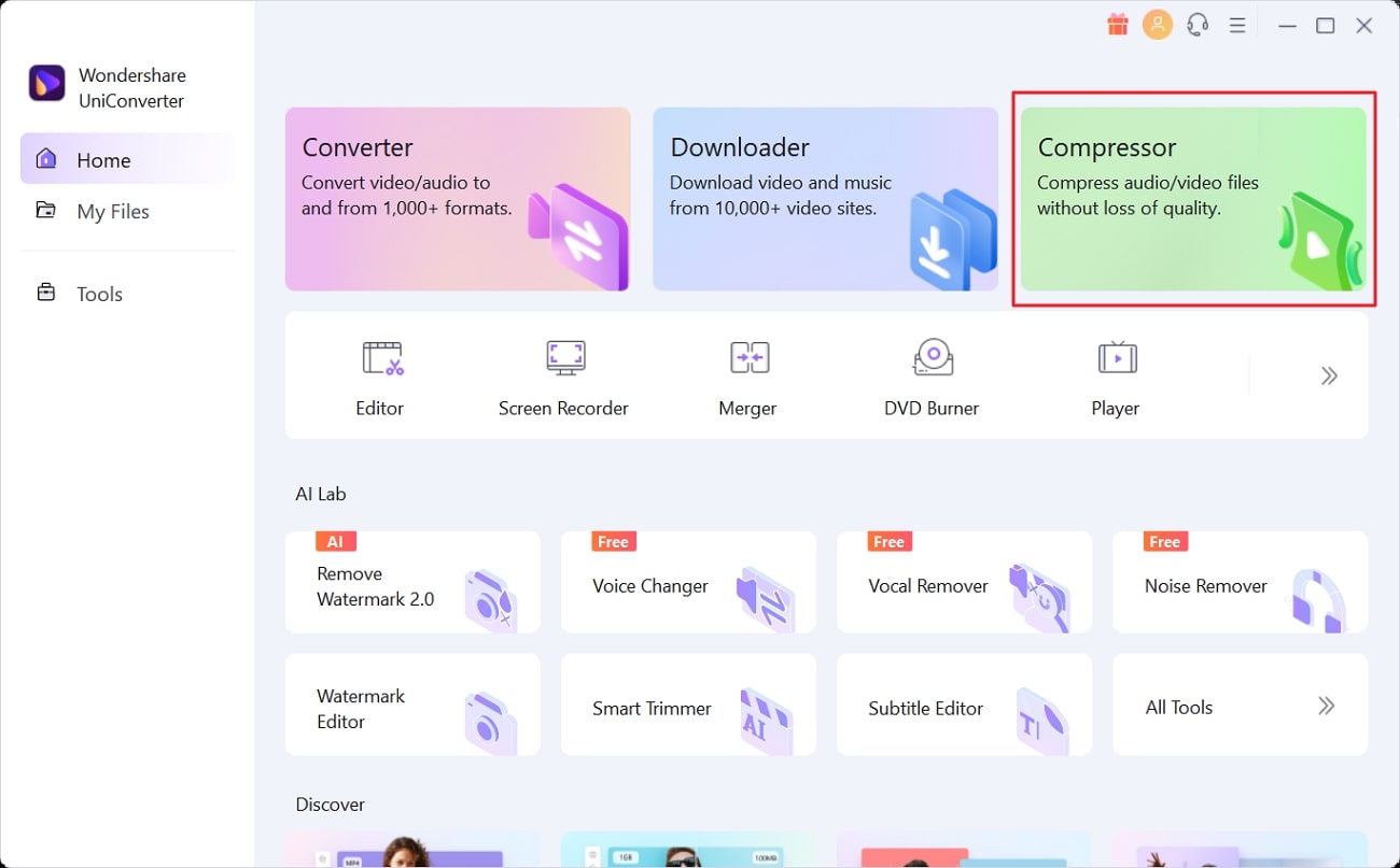 Step 1: Download Wondershare UniConverter on your device and launch it. From the home interface, click on "Compressor" and click on the "Add" button. After this, import the audio file that you want to compress.