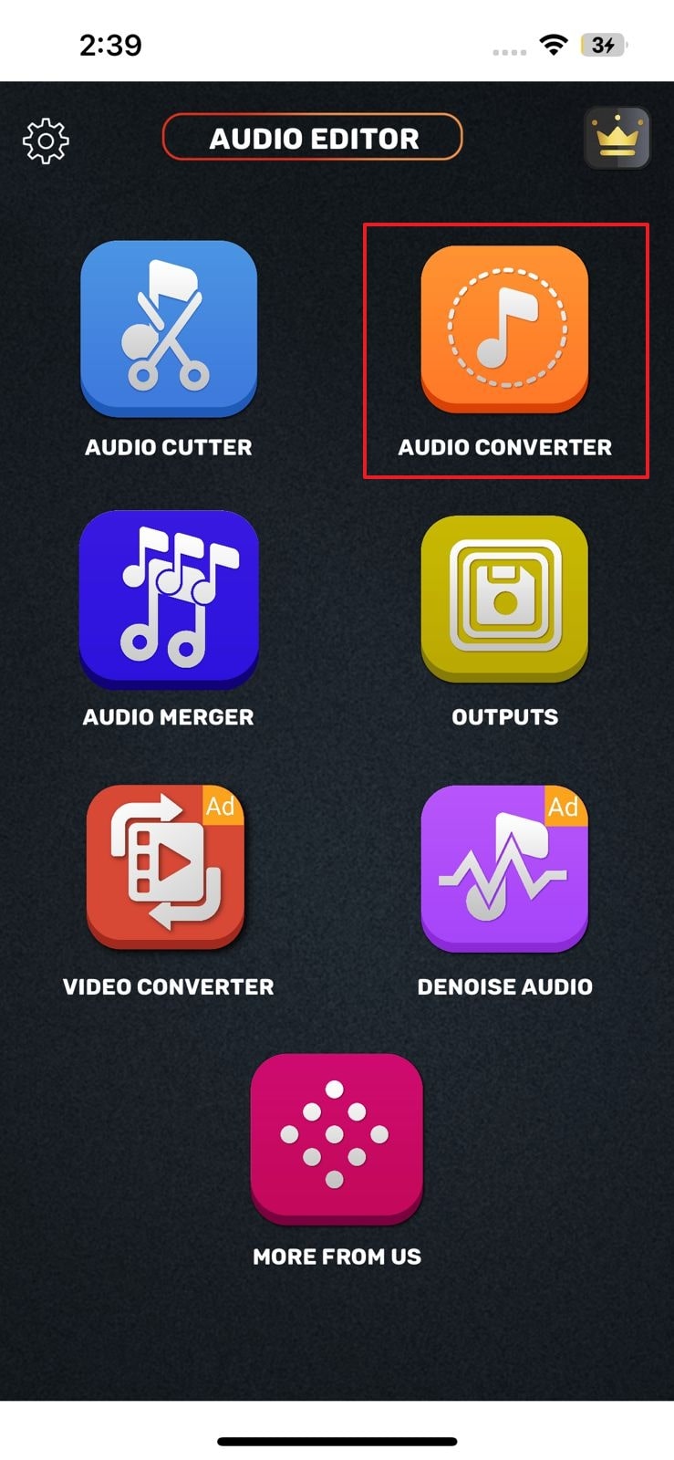 Step 1: Download MP3 Cutter, Converter, and Merger on your mobile and open it. Select "Audio Converter" from the main interface and import the audio from three given options, including "Music Library," "Cloud/Files," and "Wi-Fi."