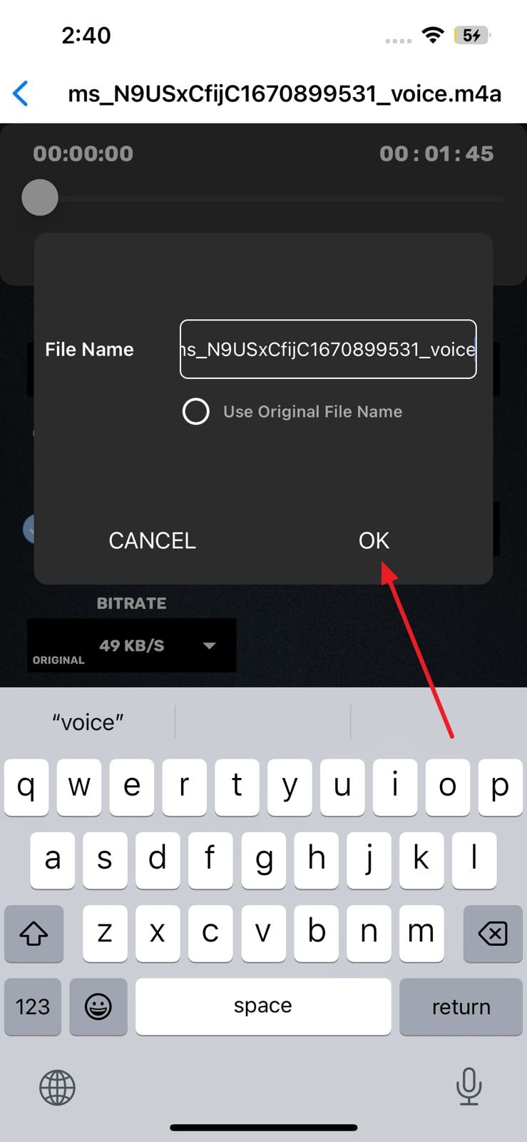 Step 3: Change the name of compressed audio from “File Name” and select" OK." Following this, your audio file will be compressed, and you can choose the "Share," "Play," or "OK" buttons.